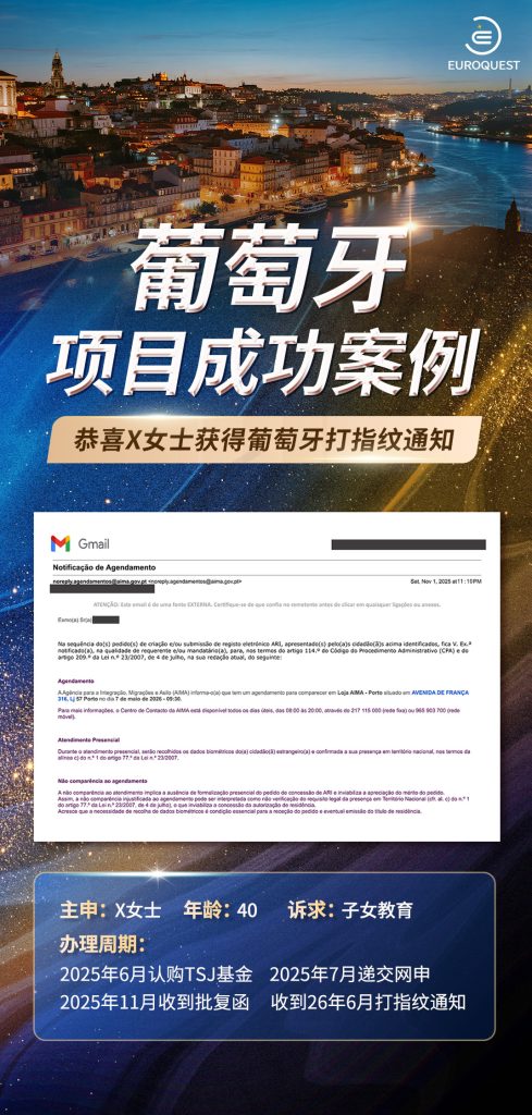 L女士于2025年1月认购TSJ基金,启动葡萄牙黄金居留申请。我们迅速在一个月内完成材料准备与网申递交,全程高效推进。